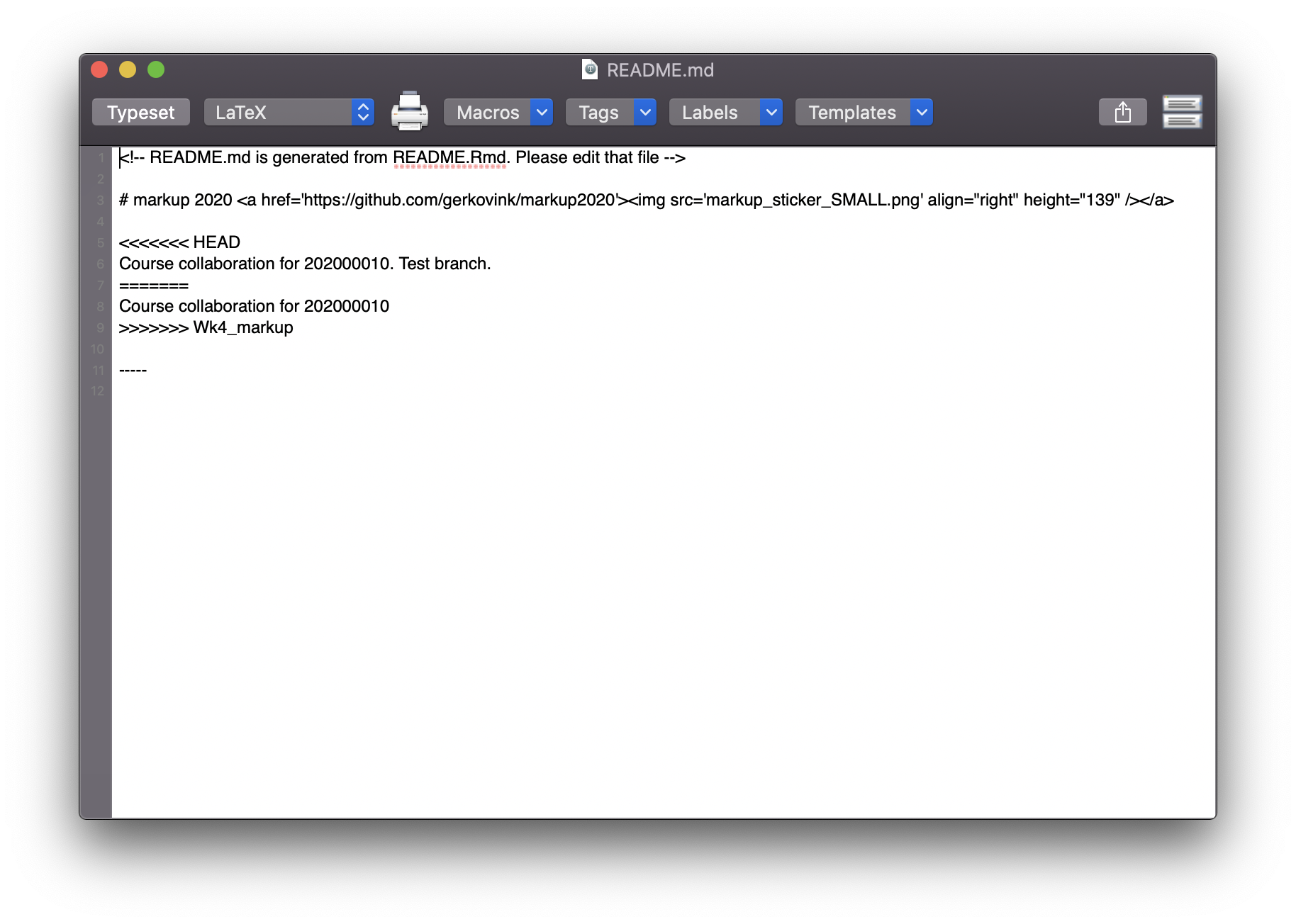 We now see the detail about this conflict. Remember that we took an old state as our point of departure? After that point I have changed the header of the Readme.Rmd file. This conflict needs to be resolved before we can merge these branches.