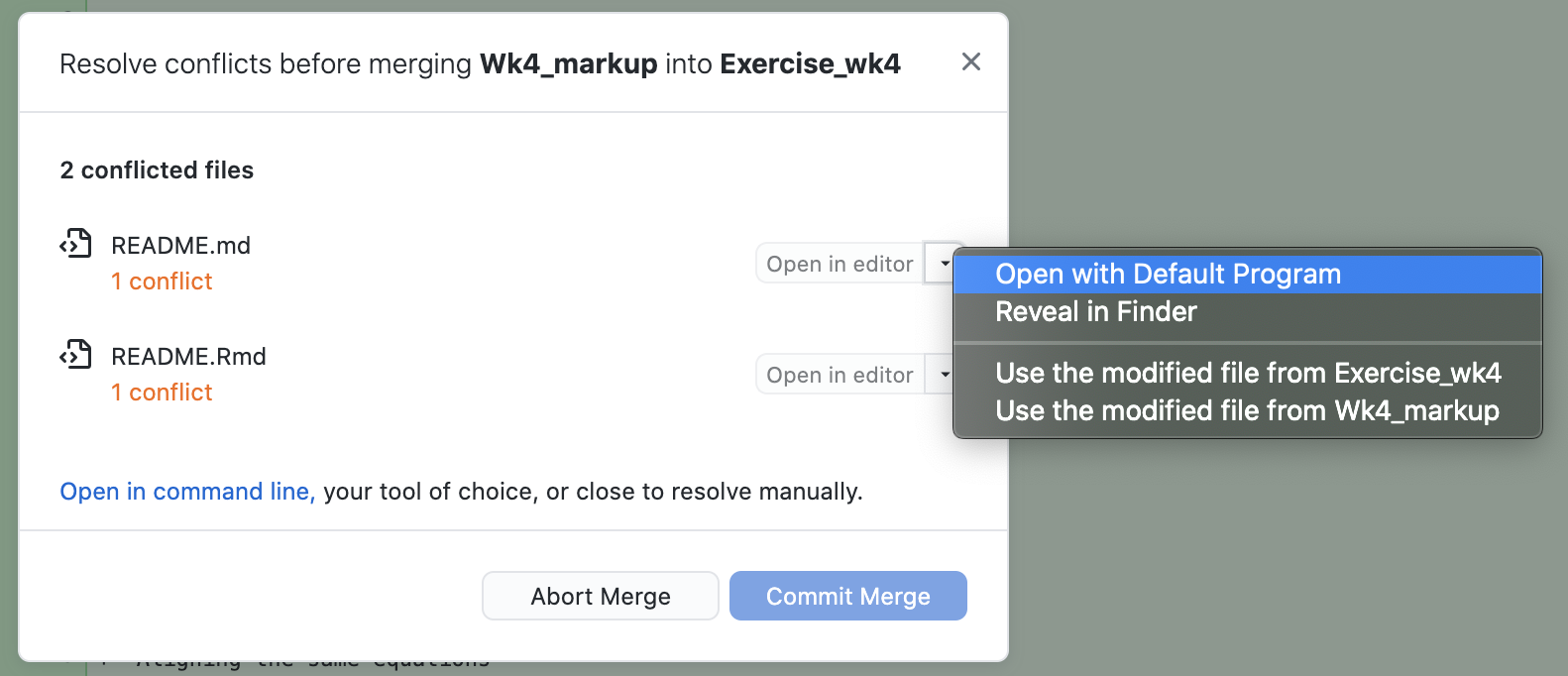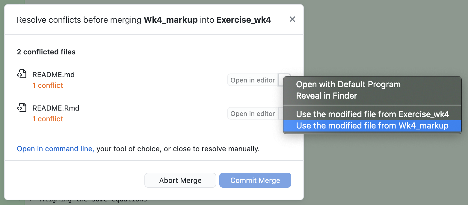 Choose Wk4_markup as the reference. Throw out the version from Exercise_wk4. You can do this manually or by choosing the following drop-down item in GitHub Desktop: